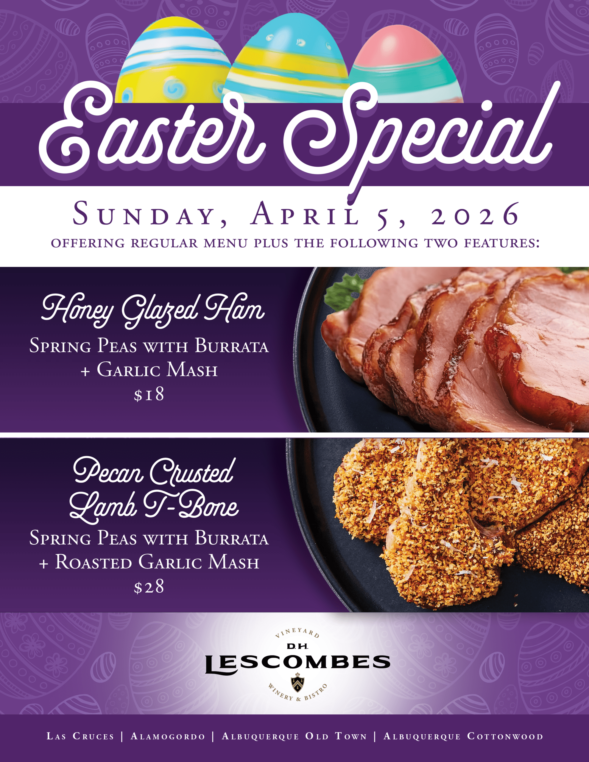 Join us at any of our esteemed locations: Albuquerque Cottonwood, Albuquerque Old Town, Alamogordo, Las Cruces, and Santa Fe, and indulge in these special Easter entrees. Reserve your table today for our Easter Sunday Special (reserve by phone) and elevate your celebration with unparalleled cuisine and ambiance.